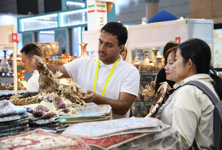 ??2024年9月20日,在陜西省西安市舉行的第八屆絲綢之路國際博覽會(huì)上,來自伊朗的參展商(前左一)向觀眾介紹產(chǎn)品。 新華社記者 張博文 攝