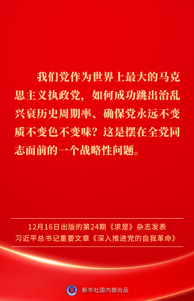 ? ?12月16日出版的第24期《求是》雜志發(fā)表習近平總書記重要文章《深入推進黨的自我革命》。我們黨為什么要自我革命、為什么能自我革命、怎樣推進自我革命?習近平總書記這樣闡述——