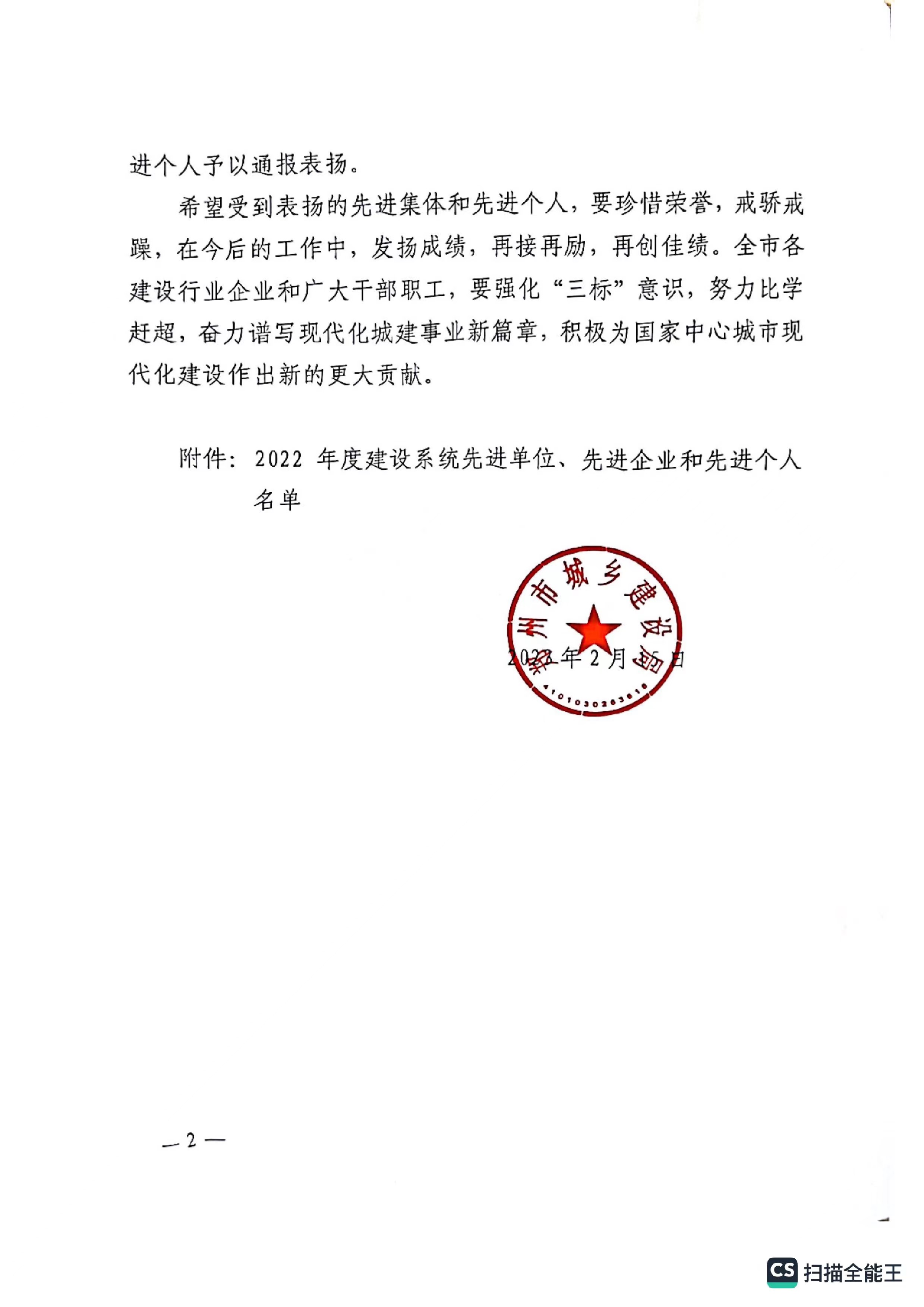 熱烈祝賀我公司獲得鄭州市城鄉(xiāng)建設(shè)局評(píng)定“2022年度建設(shè)系統(tǒng)先進(jìn)單位“企業(yè)稱號(hào)。