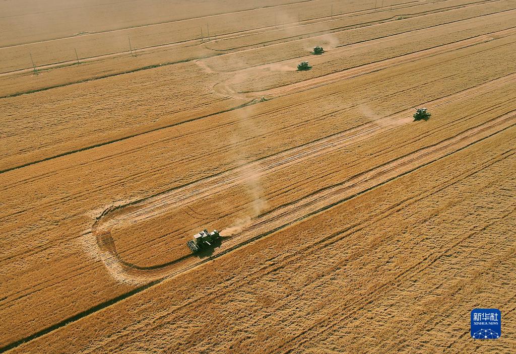 在河南省黃泛區(qū)農場九分場的麥田里,農機手操作收割機收獲小麥(2021年6月6日攝,無人機照片)。新華社記者 李安 攝