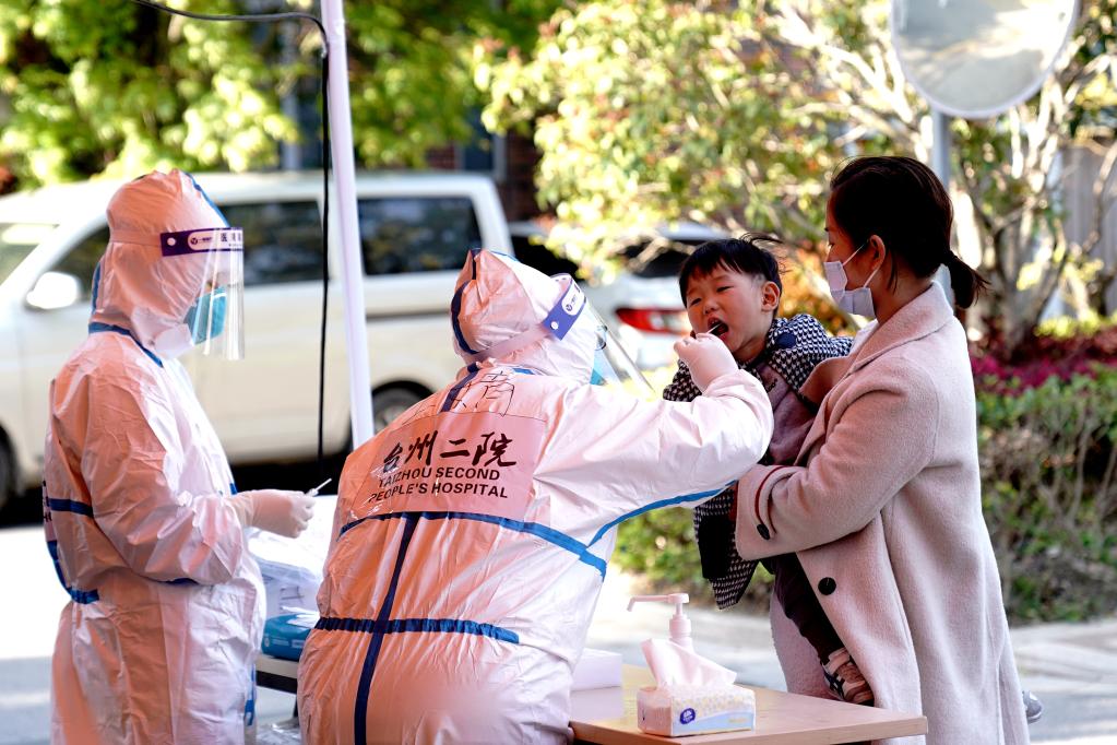 4月4日,在上海松江區(qū)祥欣居民區(qū),浙江援滬醫(yī)療隊(duì)隊(duì)員為小朋友進(jìn)行核酸檢測采樣。新華社記者 張建松 攝