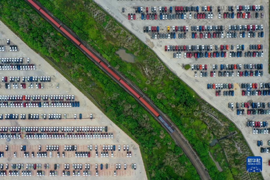 長(zhǎng)城汽車專列首發(fā)列車在重慶永川國(guó)家高新區(qū)鐵路專用線上(4月14日攝,無(wú)人機(jī)照片)。新華社記者 唐奕 攝