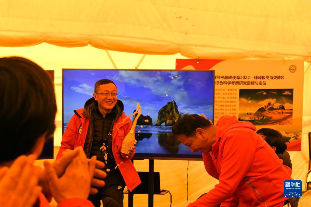 在珠峰腳下海拔5200米的總指揮會(huì)議室?guī)づ窭?,大家熱烈慶祝“巔峰使命”珠峰科考登頂觀測(cè)采樣成功(5月4日攝)。新華社記者 姜帆 攝